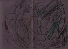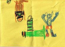 He’s drawn Captain America for me twice: once for a Father’s Day banner, and the image to the right for my birthday card. The birthday card shows a “bad guy” hanging from the ceiling, where Spider-Man webbed him up, and a robot knocked to the ground by Cap. (The second image to the right is from my 2 year old.)