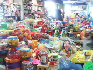 Anyway, durin’ the organization for this sale, we usually haul our junk down there early in the set up day (a week before the event). Every time I’ve taken our stuff in the buildin’, it’s been mostly empty. But this time I took our stuff late in the day, and I got to see what the sales floor really looks like. There’s toys and equipment everywhere; dozens of everything, all over the floor and tables.